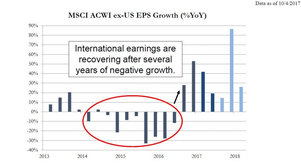 First, we have monitored the earnings per share growth of the All Countries World Index (excluding U.S. markets) over the past five years. Earnings have finally begun to recover after several years of negative growth, and the projections for 2018 are quite optimistic by comparison (see Figure 3). When coupled with the corresponding trends in GDP growth shown in Figure 2b, the outlook for international investing appears to be promising.