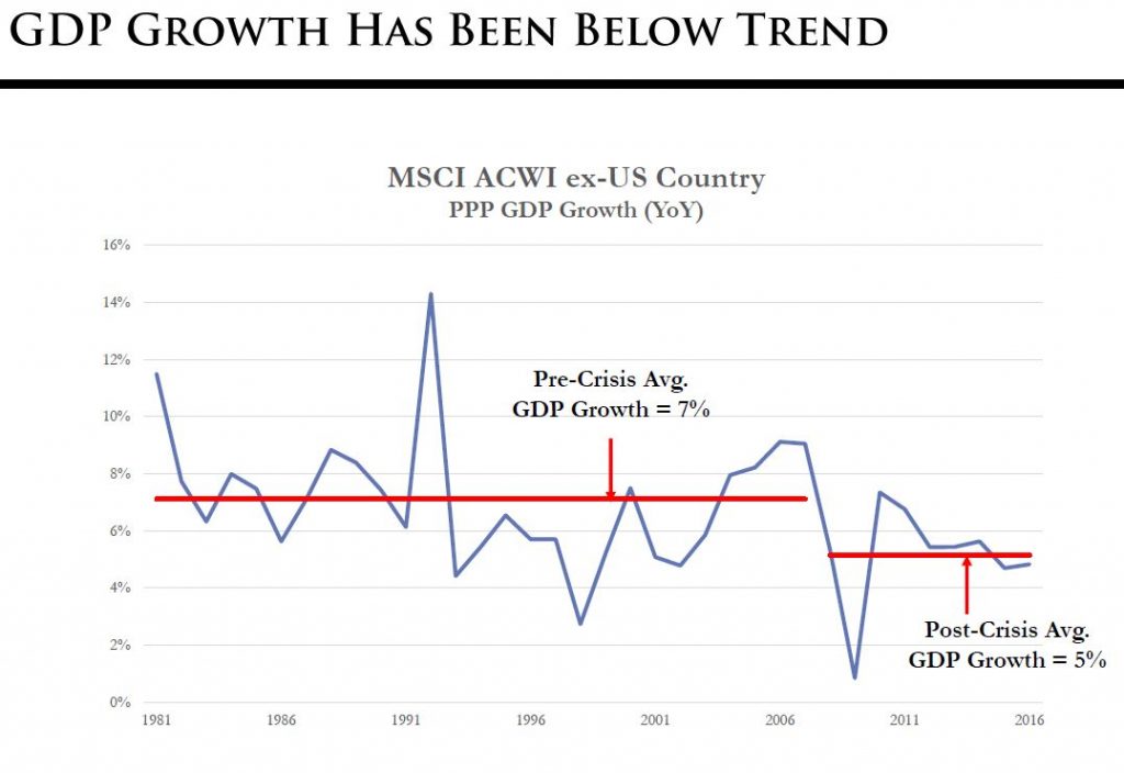 Figure 4. The post-recession GDP growth of nations outside the U.S. has lagged behind the average annual growth rate of 7% from 1981-2008.