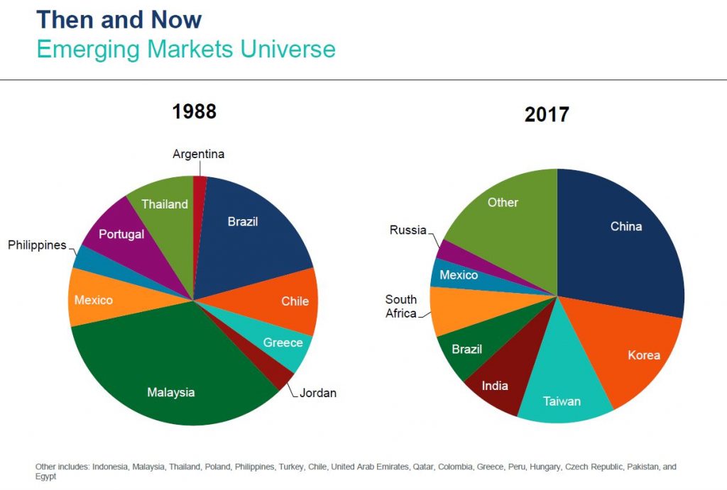 In figure 6, we observe that the international investing landscape has changed drastically since the late 1980s. As an example, Malaysia represented a large cross-section of the emerging markets universe in 1988; today, Malaysia is no longer a major player. China, Korea and Taiwan have emerged as the leading emerging markets, whereas many of the Latin American economies have fallen from prevalence.