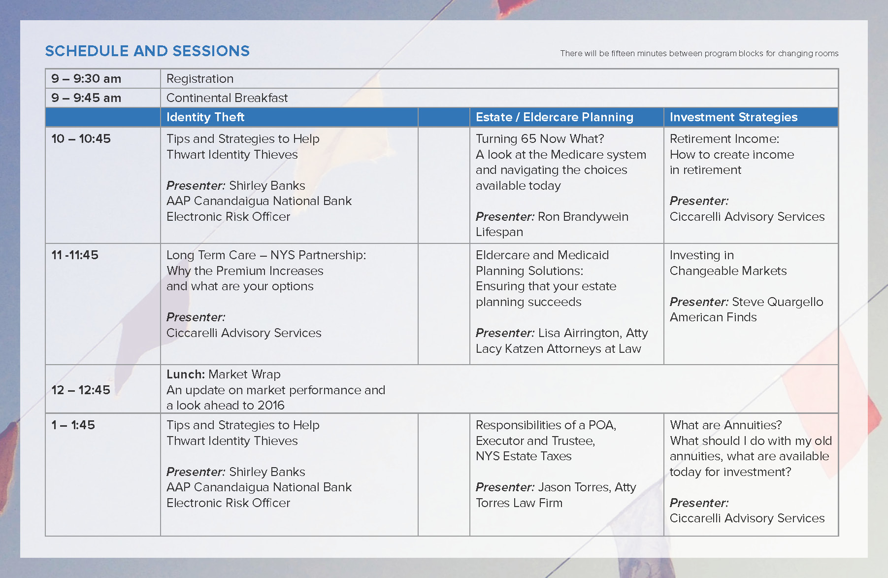 We have planned a fun and informative day for you! This day will include a number of sessions for you to attend, hosted by guest speakers from our area. Topics include Tips and Strategies to Help Thwart Identity Thieves; Long Term Care Premium Increases and Your Options; Turning 65?: A Look at the Medicare System; Responsibilities of a POA, Executor, and Trustee, and more! Our traditional October Market Wrap session will be offered during lunch.