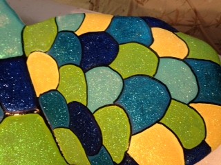Terrance is 4’ high by 4’ wide and weighs about 75 pounds. His design comprises beautiful sea-based hues of blues and greens, reminiscent of the vibrance of the under-water world, with splashes of gold. He is brought to life using various mediums including acrylic, glitter and sea glass. Nancy’s inspiration comes from her passion for landscapes and wildlife. She wanted Terrance to reflect the colors of the sea and the coral reefs, but also sparkle like the sun’s rays reflecting on the ocean’s surface.